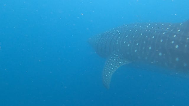 We all jumped into the water, in what was a much more orderly fashion than I would have thought possible. Still pretty clueless, I followed in the general direction of the rest of the group, while trying to get our recently acquired GoPro to switch on, clearing the water out of my mask, reattaching my flipper which had come loose and then confirming that I had no idea where I was supposed to be, or what direction I should be facing. I didn't want to give up just yet, so submersed my head and lo and behold, no more than a couple of meters in front of me, was the most majestic whale shark, striped and spotted just like in the brochures, a huge fish swimming languidly just below the surface of the ocean, with my view not spoiled by any of the rest of our group (who were all presumably where they'd been told to be). Although these massive fish swim slowly, it's still faster than most of the group, so it quickly left us behind as it headed for group B who were now in the water, and the boat came back to pick us up. These whale sharks have very vivid markings, comprising white spots and faint lines. Although the literature describes the white spots as random, they look to me like they lie in straight horizontal and vertical lines - a bit like having a giant chessboard where most of the squares have a white spot but some are left blank. Perhaps you can understand what I mean from the still taken from my 3 second GoPro video (I said I was struggling to get everything to work).