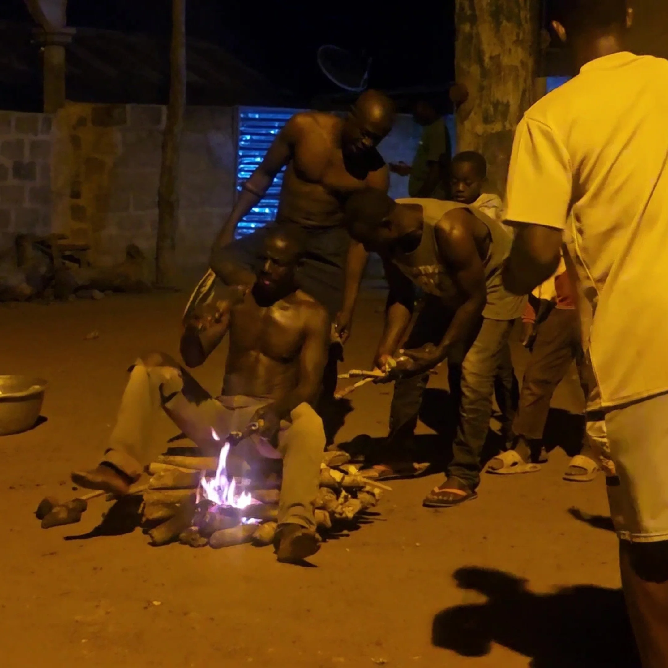 We don’t usually drive at night, but a fire dance in daylight rather defeats the point. Following our guide’s fluorescent shirt as he sped off on a moto-taxi, we turned down a narrow, unlit alley between mud houses. Whether it was the darkness, the long day or the absence of English, the atmosphere felt markedly different. There was no real welcome – just a fire in the lane and a wooden bench against a wall.