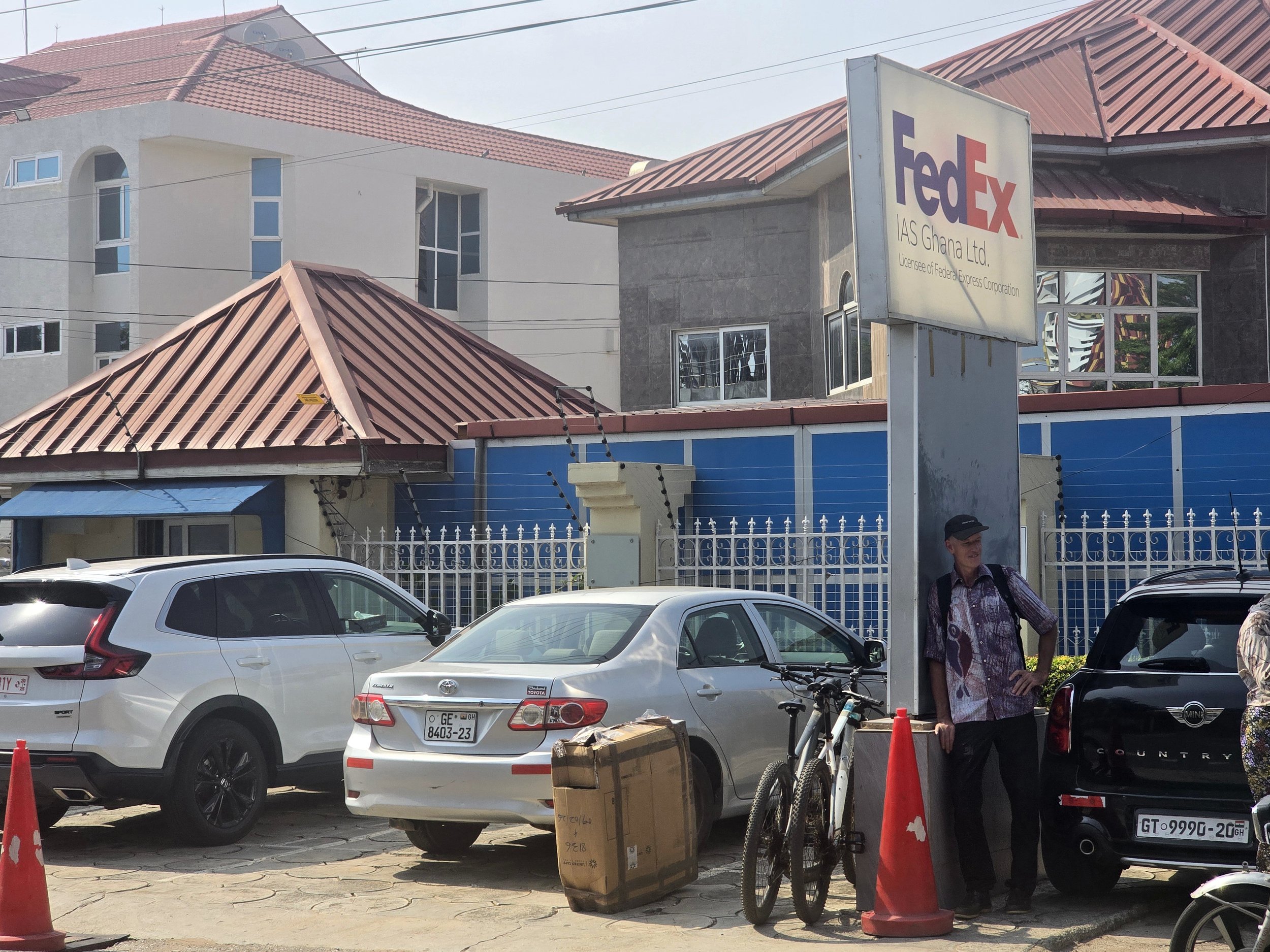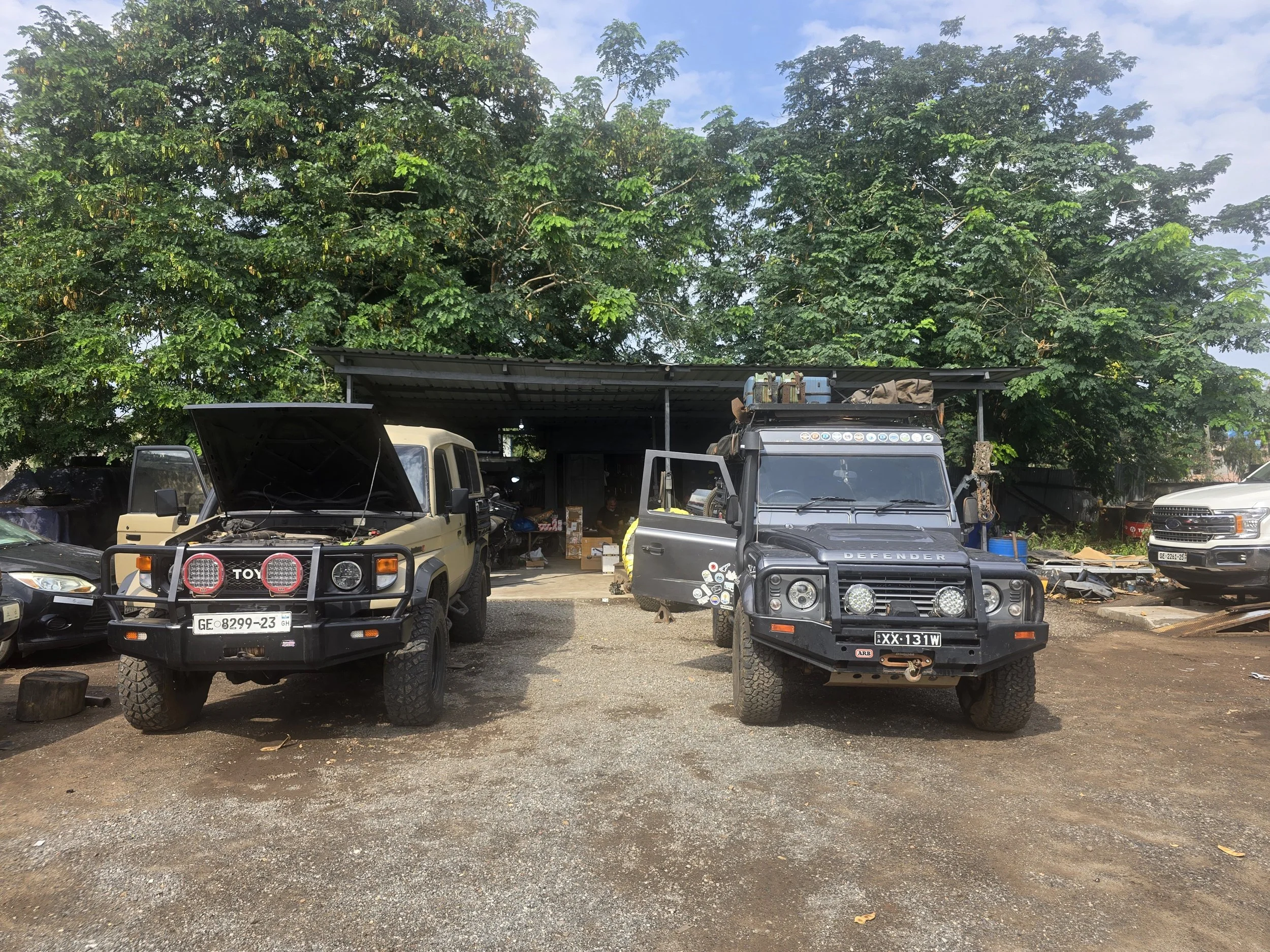 With the mis-matched spare on, we rolled into Accra and straight into Bilal’s Legendary Workshop. Handing Bob over was a relief; the diagnosis wasn’t. The brake servo was fine – the master cylinder had failed. So: find somewhere to stay, order parts and wait. Importing those parts – plus a BF Goodrich tyre – proved eye-watering. Duties and VAT were just the start; health, education, regional and development levies, plus processing and inspection fees, nearly doubled the cost. In Freetown we’d paid none of this, and everything had been delivered. In Accra, we cycled endlessly between UPS and Fedex trying to locate our parcels. Retrieving the tyre from Fedex took most of the day, a cavernous warehouse, teetering piles, crowds hunting parcels and the same details copied into multiple ledgers. Storage fees, tips – everyone stuck in the same slow grind.