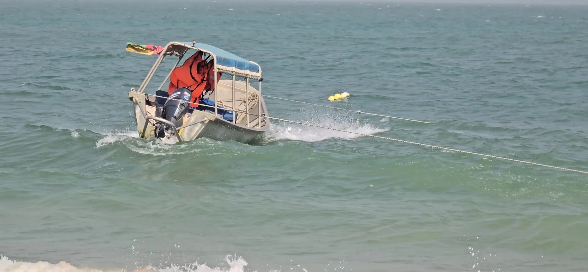 Leaving Poilao we had arranged to get dropped off on Bubaque, the main island, rather than returning to Orango with the others. Our planned early start was delayed due to strong winds but when conditions hadn’t improved much by mid-day the decision was made to leave anyway. It was a bit disconcerting to observe our little boat being thrown around by rolling waves and straining at the two ropes anchoring it just off the shoreline and boarding was no easy matter in the waist deep surf. Eventually, we were all in, room somehow having been found for a dozen or so plastic-coloured chairs, tents and cooking equipment. The little boat struggled to make progress through the choppy waters, each wave met with a resounding slap that reverberated up our spines with increasing intensity. Visibility was limited due to the large wash of water coming over the sides of the boat but at least the bilge pump was working and only one of the metal struts securing the canopy had detached. After 2 and a half hours, just when we were expecting Bubaque to appear, we motored over a long fishing net suspended by a series of surface floats. The look of surprise on the crew’s faces was clear indication that we were off course. This was confirmed when the question “Has anyone got a phone with GPS?” was heard from the back of the boat. Ian loaded MapsMe and handed it over and, after some consultation, a 90 degree turn to the left was made and we tentatively set off. We hadn’t gone more than 50m when the engine was switched off again and the next question came “Is anyone able to read the GPS map?” A quick look confirmed that our correct course was in fact 180 degrees to the right, we were about 15km further out to sea than we should have been.