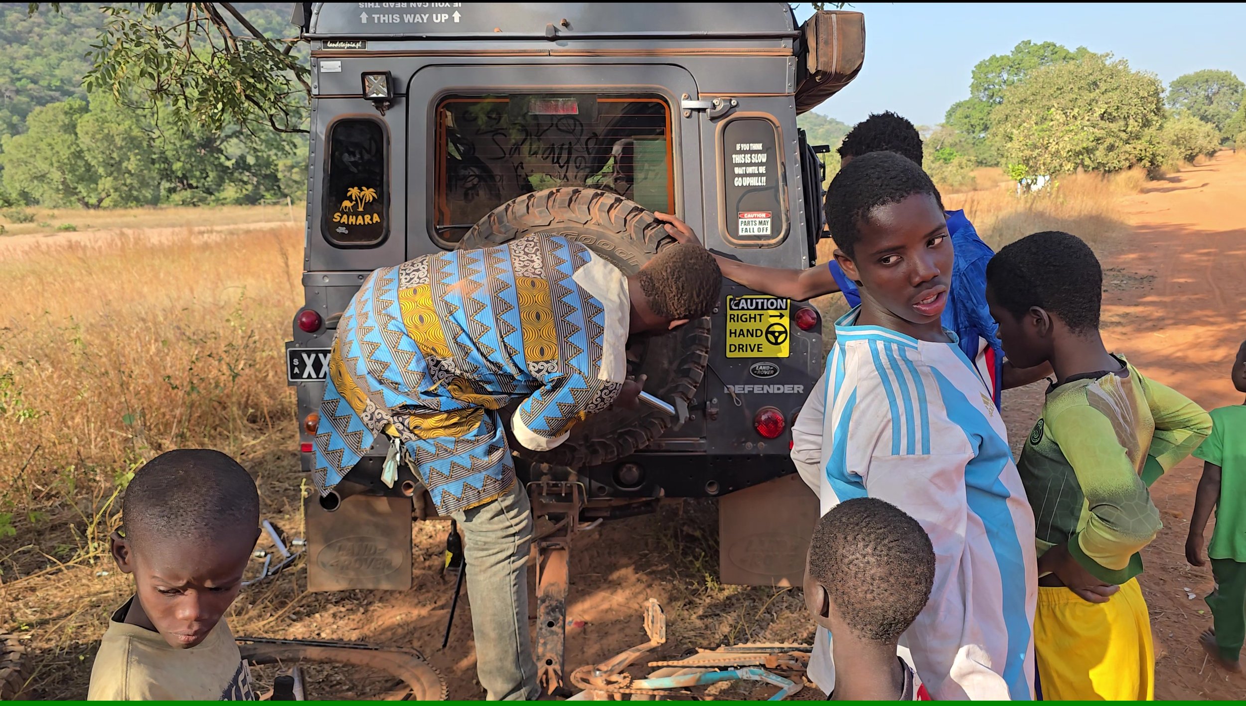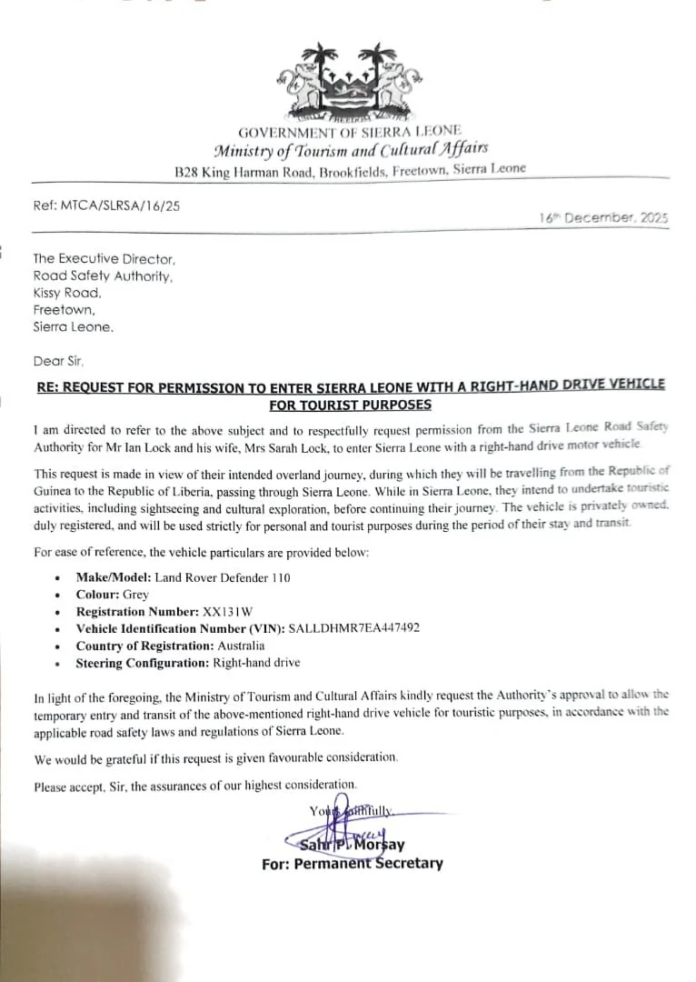 What followed offered more insight into the inner workings of Sierra Leone’s ministries than we ever knew we needed - or wanted. The Ministry of Land Transport, Ministry of Tourism, the British Embassy, and the Station Chief of the Road Safety Corps were all contacted.  As we sat beneath a sign reading “Welcome to Sierra Leone”, Ian made over 120 phone calls while twenty-four hours quietly slipped by, before the Station Chief finally arrived, apparently keen to join the spectacle.